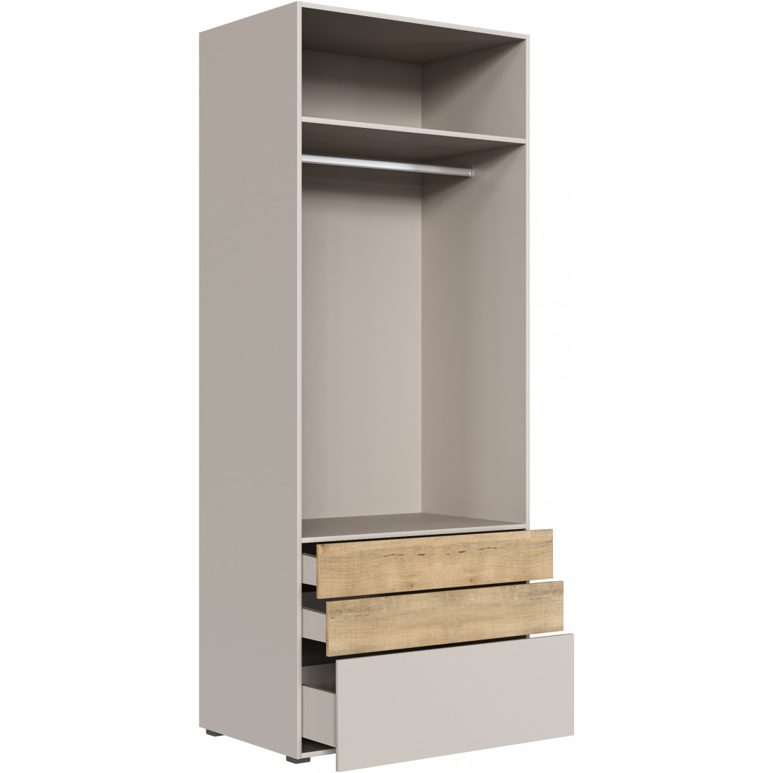 • Шкаф двухстворчатый, укомплектованный полкой, штангой и 3-мя выдвижными ящиками;