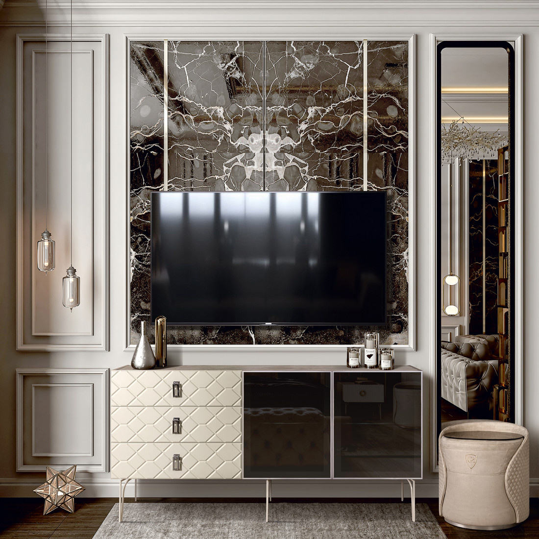 Стекло Stopsol меняет свои отражающие свойства под воздействием источников света. Поверхность, отражающая свет, мягко скроет содержимое вашего комода или витрины.