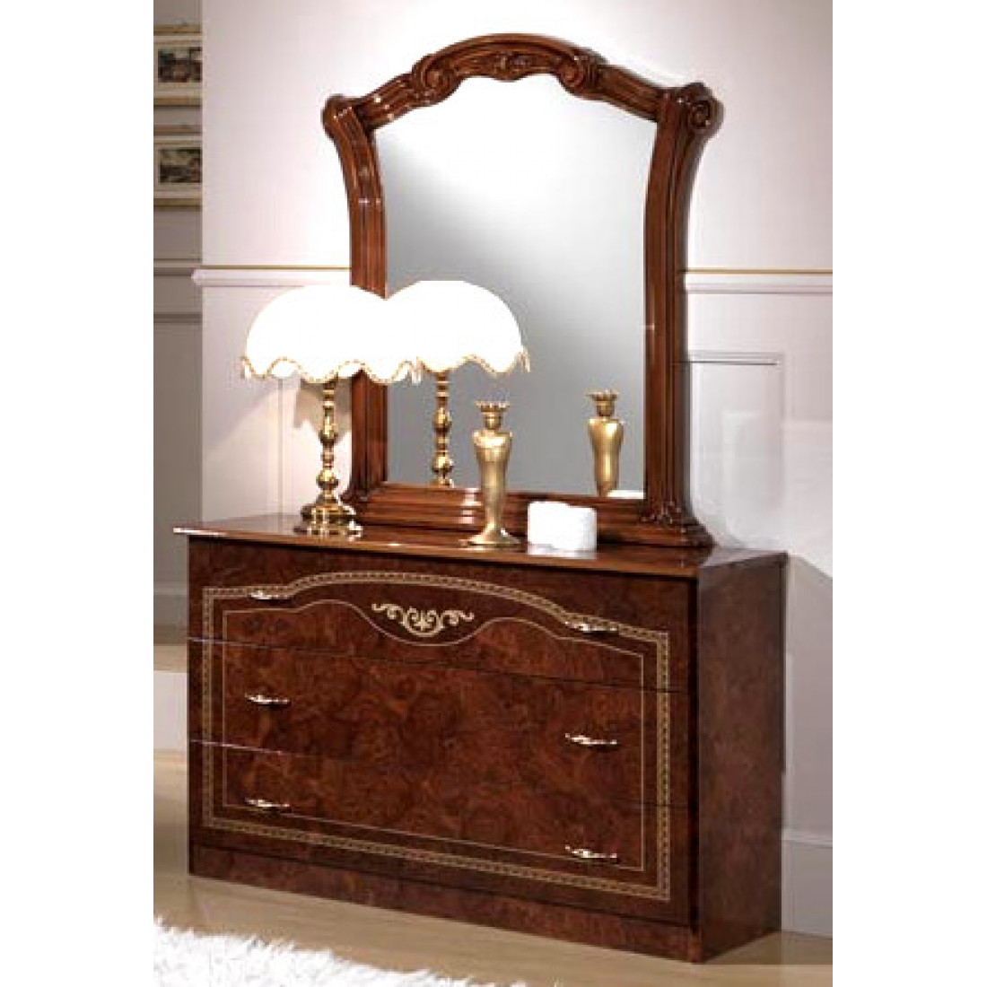 Комод с зеркалом Ирина (орех) от Российской фабрики «ДИА мебель» выполнен в ореховом цвете в сочетании с глянцевым покрытием. Имеет три вместительные, открывающиеся полки. Такой многофункциональный комод поможет Вам с экономить место в спальне. Большое зеркало поможет визуально расширить комнату. Коллекция "Ирина" предназначена для настоящих ценителей классического стиля.
