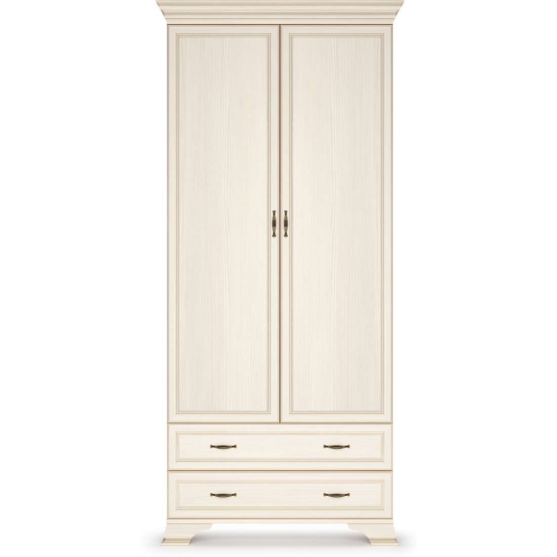 Для Шкафа применяется ЛДСП и МДФ в цвете «бодега белый» с эффектом патинирования золотом. Облик дополняют рамочные фасады и карниз в классическом стиле, а также эффектные опоры из МДФ.