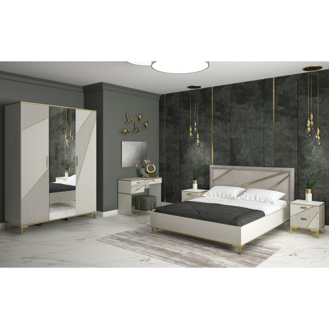 Фасады: МДФ, декор – кашемир серый, патина золото, зеркало с гравировкой