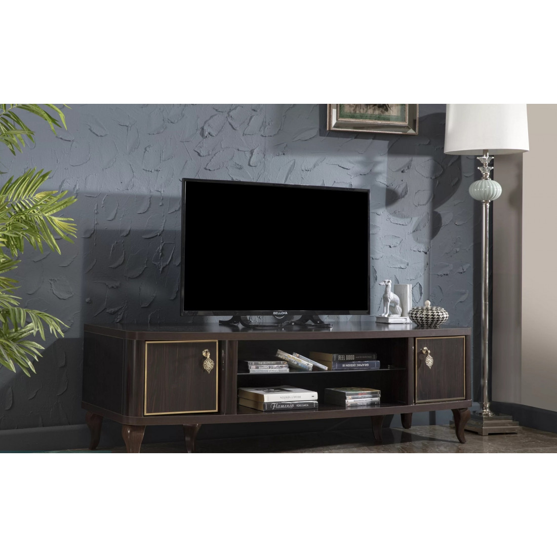 Тумба под ТВ "Легенда" предназначена для размещения большого плазменного телевизора. Ее дизайн заслуживает Вашего внимания, изделие представлено в классическом белом стиле с золотистыми полосами на дверцах и белыми изогнутыми сужающимися к полу ножками. По центру тумбы находится углубление под два отделения, разделенные стеклянной полкой. За счет использования высококачественных материалов, удалось добиться долговечности данного изделия.