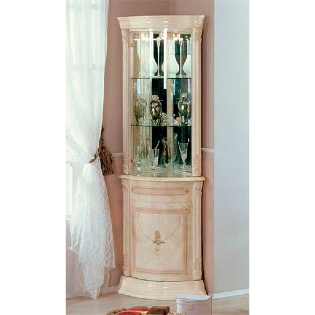 Угловой шкаф-витрина Роза (беж) от фабрики ДИА мебель выполнен в классическом стиле. Стеклянные полки и зеркальный корпус придадут чувства легкости и удивят Вас своей вместимостью. Бежевый цвет в сочетании с глянцевым покрытием и золотистым орнаментом на фасаде придает этой модели изящность и элегантность. Такая шкаф поможет заполнить место даже в самых пустых уголках вашей гостиной. Послужит идеальным дополнением к другим модулям.