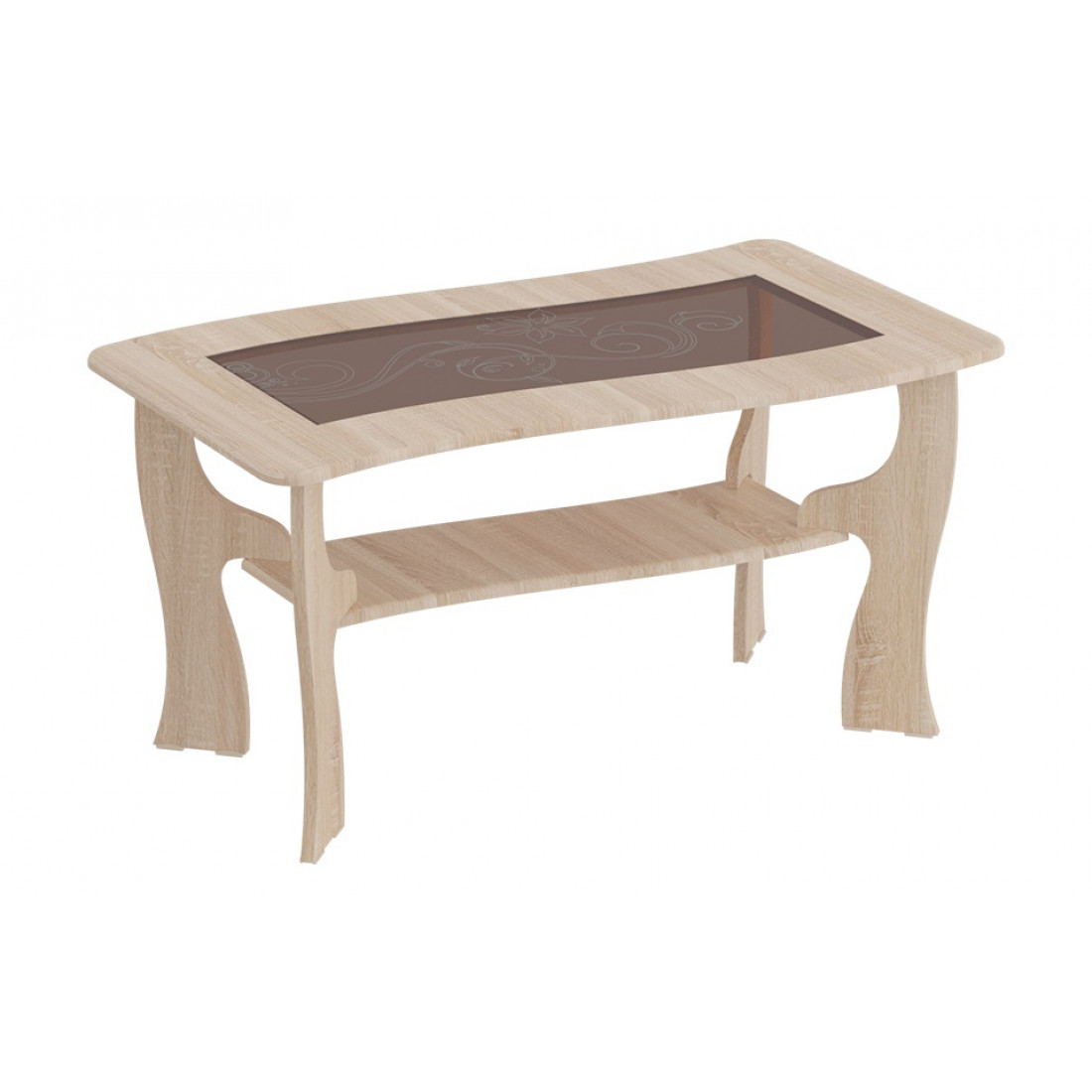 Широкий прямоугольный журнальный столик в гостиную от фабрики МебельГрад со стеклянной столешницей подойдет для оформления современного или классического интерьера. Стекло столешницы тонированное, декорировано пескоструйным рисунком. Модель представлена в двух цветах - Венге Мали или Дуб Сонома на выбор.